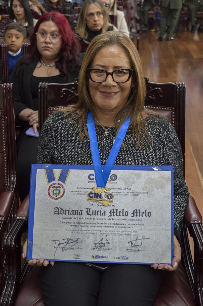 Dra. Adriana Lucia Melo Melo – Secretaria saliente de Desarrollo Social de Cundinamarca. Por impulsar iniciativas de inclusión, formación y bienestar para la primera infancia, juventud, mujeres y poblaciones vulnerables en Cundinamarca.