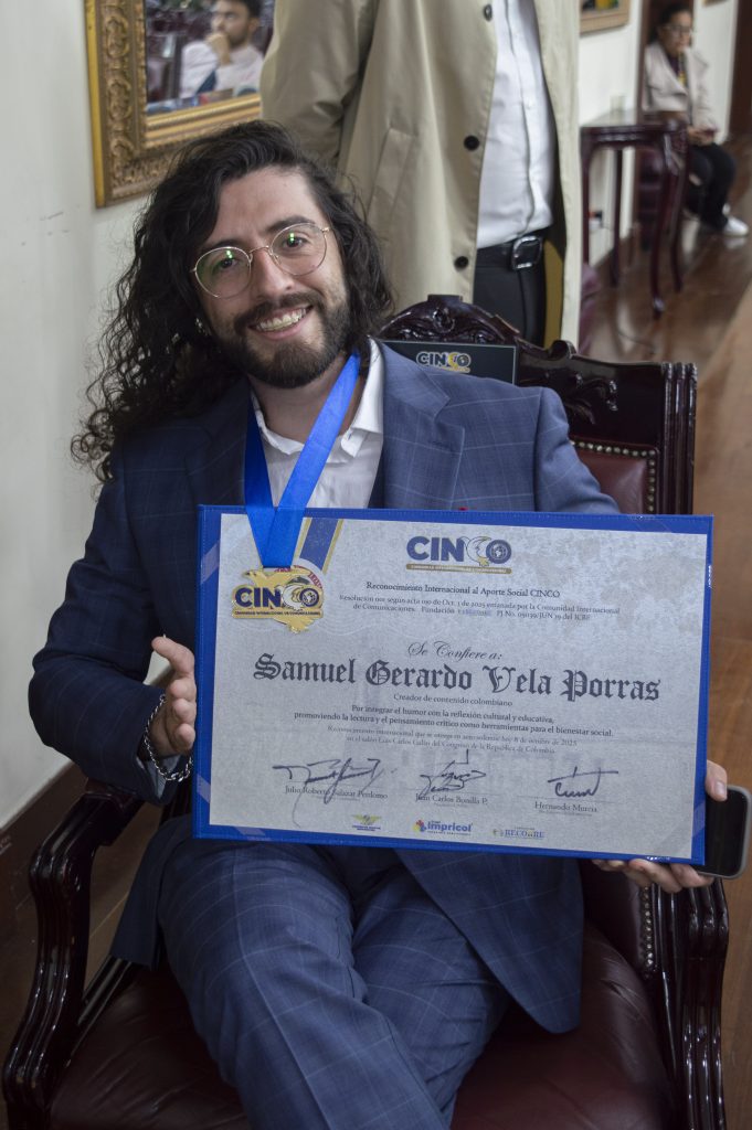 Sr. Samuel Gerardo Vela Porras – Creador de Contenido Colombiano. Por integrar el humor con la reflexión cultural y educativa, promoviendo la lectura y el pensamiento crítico como herramientas para el bienestar social.